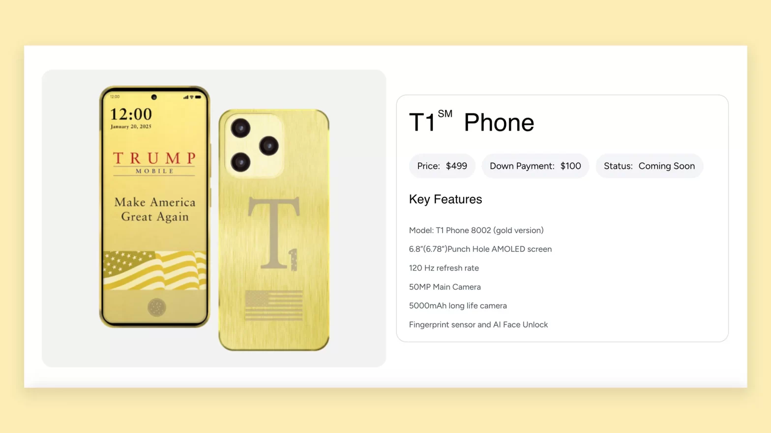 También anunció que próximamente estará disponible el modelo T1, un teléfono inteligente «dorado y elegante», que funcionará con sistema operativo Android y tendrá un costo inicial de $499 dólares.