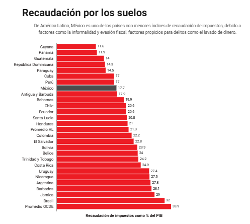 “El tema de lavado de dinero no solo tiene que ver con el narcotráfico, también con la evasión fiscal. Lamentablemente México se ha caracterizado por tener una de las menores recaudaciones de impuestos, sobre todo de ISR, en la OCDE, y en Latinoamérica”, explicó Manuel Herrera Espinosa, presidente del Comité Nacional de Estudios Económicos del Instituto Mexicano de Ejecutivos de Finanzas (IMEF).