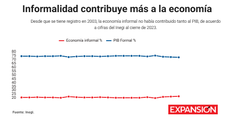 La economía informal en México registró una participación de 24.8% en el PIB en 2023, es el nivel más alto del que se tiene registro, al menos de los últimos 20 años.