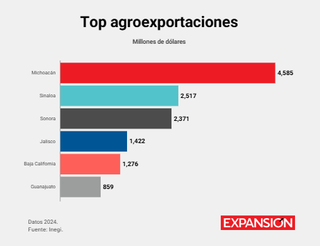 Con una participación de 26.3% en el valor agroexportador nacional, Michoacán supera con amplitud a Sinaloa, Sonora, Jalisco, Baja California y Guanajuato.