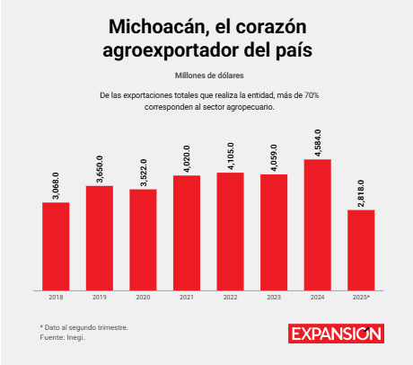 Michoacán es el gran motor agroexportador de México. En 2024 vendió en el extranjero 4,584 millones de dólares en productos del campo, que lo coloca como líder en el país. Ese poder económico atrae la atención del crimen organizado, que extorsiona a productores, fija precios y controla rutas. En muchas comunidades rurales, la violencia ya ha cobrado vidas.