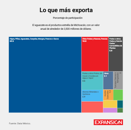 Además del “oro verde”, la entidad envía al exterior guayaba, fresas, zarzamoras, higos, piñas y mangos, que fortalecen su posición en el mercado agroalimentario. Más de 70% de las exportaciones michoacanas pertenecen al sector agropecuario.