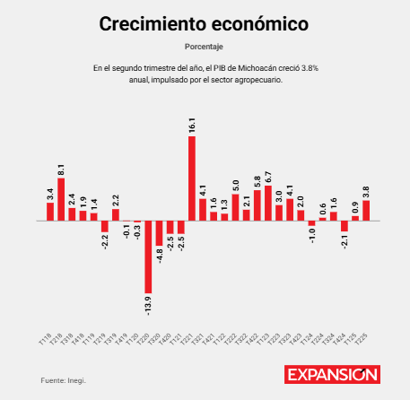 Durante el segundo trimestre de 2025, la actividad económica de Michoacán aumentó 3.8% anual, impulsada por un salto de 12.5% en el sector primario, 5% en el secundario y 1.7% en el terciario.