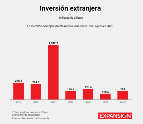 En contraste, la inversión extranjera directa muestra altibajos. En el segundo semestre de 2025 acumula 161.4 millones de dólares, 20% menos que un año antes. En 2021 registró un récord de 1,032 millones, pero desde entonces mantiene una tendencia irregular.