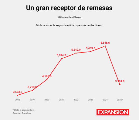 Según el último censo del Inegi, elaborado en 2020, el 22.9% de los 1.5 millones de hogares en Michoacán depende de remesas.