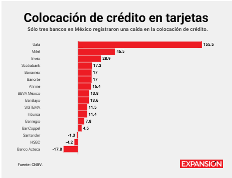 Los bancos que más financiamiento brindaron vía plásticos son Ualá, Mifel e Invex hasta el tercer trimestre de este año, de acuerdo con cifras de la CNBV.