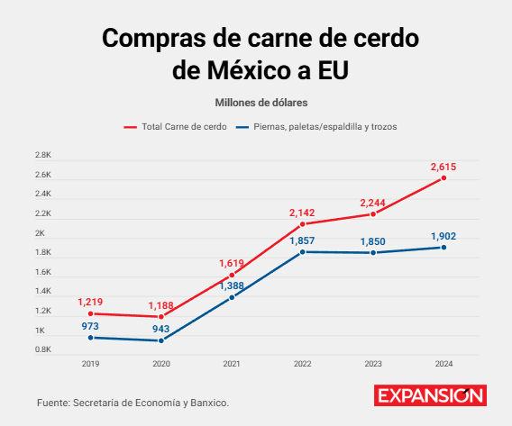 Las importaciones mexicanas desde Estados Unidos de estos productos agropecuarios muestran un incremento notorio en los últimos años. En 2019, las compras de carne de cerdo sumaron 1,219 millones de dólares, de acuerdo con datos de la Secretaría de Economía. Para 2024, el monto llegó a 2,615 millones de dólares, un aumento de 2.1 veces.