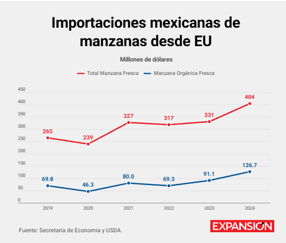 En las manzanas frescas, la tensión se concentra en las orgánicas. En 2022, Estados Unidos vendió 69.3 millones de dólares de estas a México. Para 2024, la cifra subió a 126.7 millones de dólares, según datos del Departamento de Agricultura de Estados Unidos.
