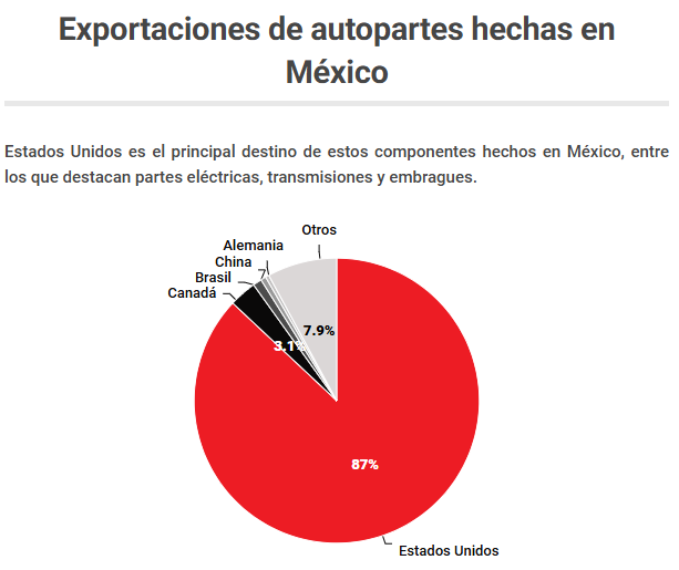 Las autopartes hechas en México encuentran en el país vecino del norte su principal destino, al alcanzar el 87% del total de las exportaciones, seguido por Canadá, Brasil, China y Alemania.