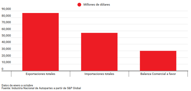 Las exportaciones de estos componentes totalizaron de enero a octubre 86,758 millones de dólares, resultando en una balanza comercial superavitaria por 29,863 millones de dólares, de acuerdo con datos de la INA a partir de S&P Global.
