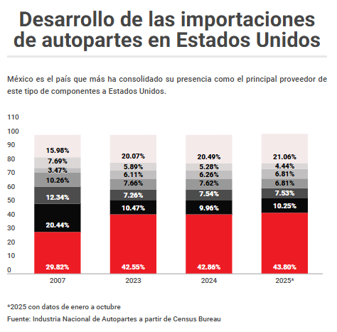 El dato más antiguo del organismo, en 2007, muestra el desarrollo que ha tenido la producción de autopartes hechas en México hacia Estados Unidos, partiendo de un 29.82% en ese entonces, mientras que, en el caso de otros países, como Japón y Alemania, los porcentajes han descendido en lugar de ir al alza.