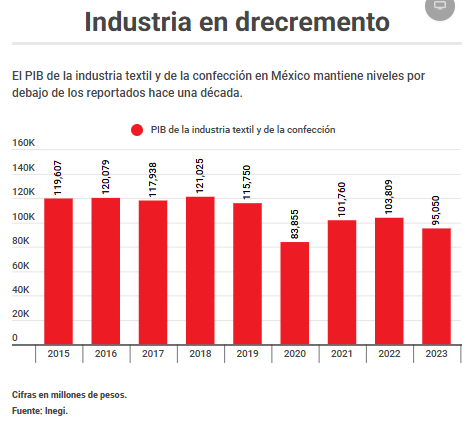 El valor del sector textil está a la baja. Entre 2015 y 2023, el PIB de la industria textil y de la confección cayó 20%, al pasar de 119,607 millones de pesos a 95,050 millones de pesos, según los últimos datos publicados por el Inegi sobre la industria, cuyas mediciones ahora se integran al sector manufacturero.